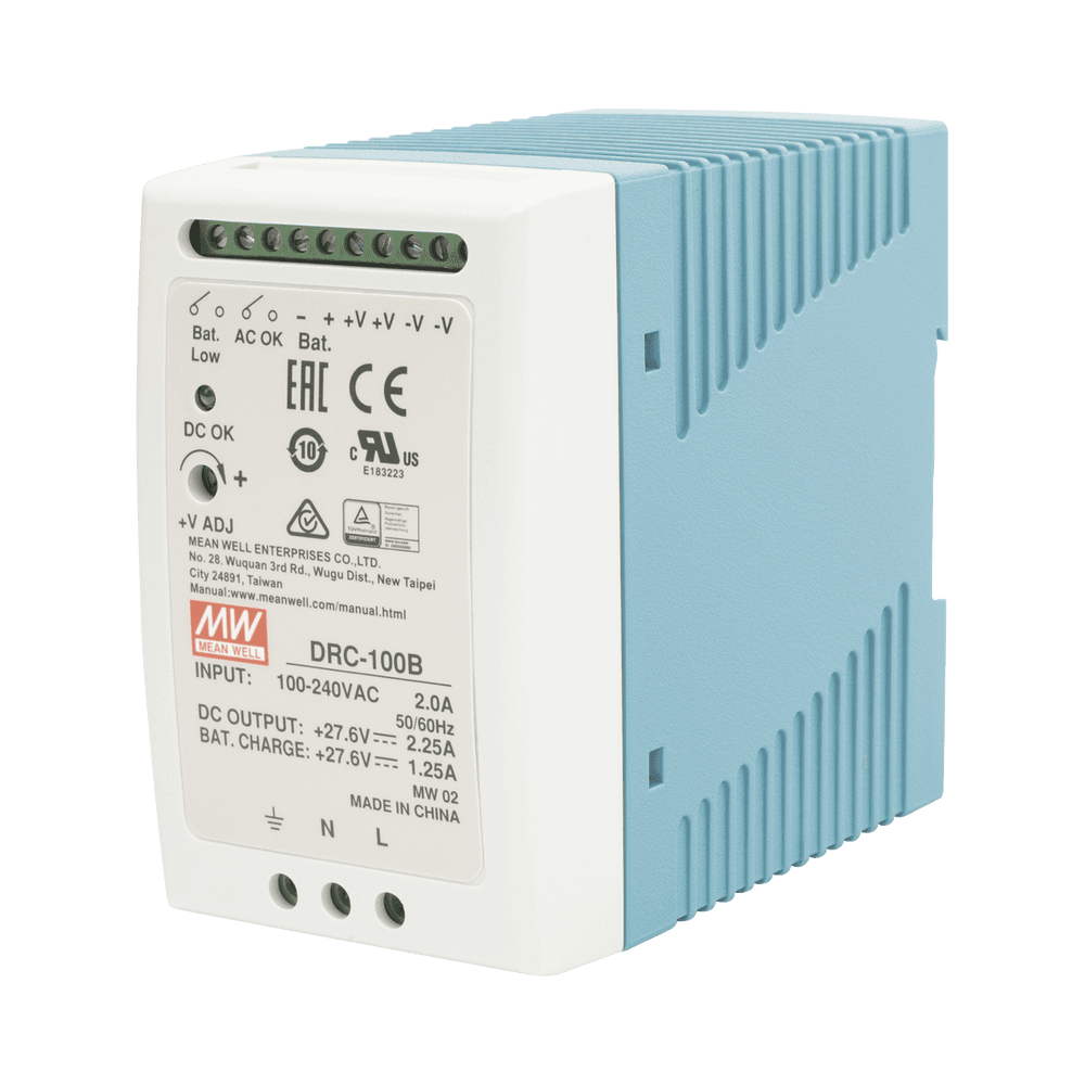 Fuente de poder Riel Din 24V, 100W con Cargador de Bateria. Marca: MEANWELL. Modelo: DRC-100-B.